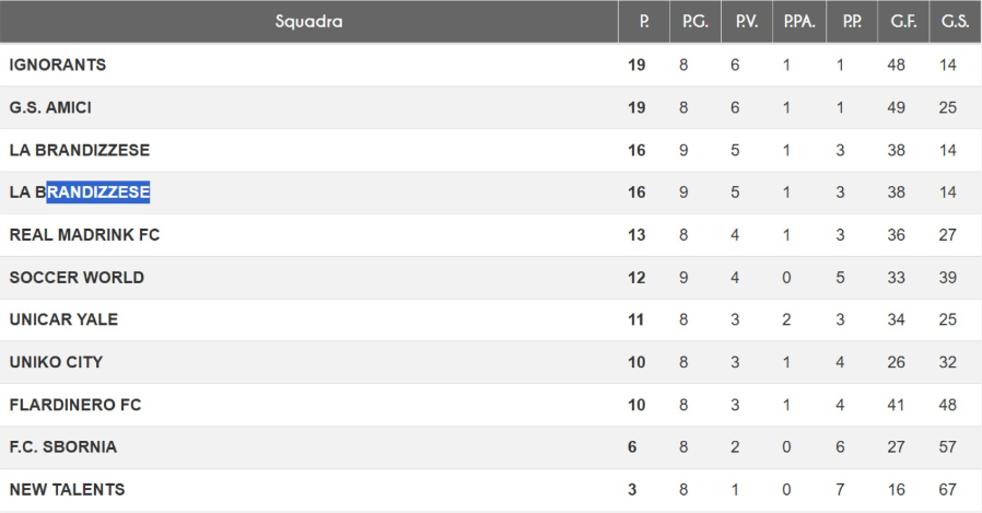 Mer 21 Gen 2026 ORE: 21:00:00Arbitra: Gug. V.PARTITA:  LA BRANDIZZESE vs SOCCER WORLD 6-1